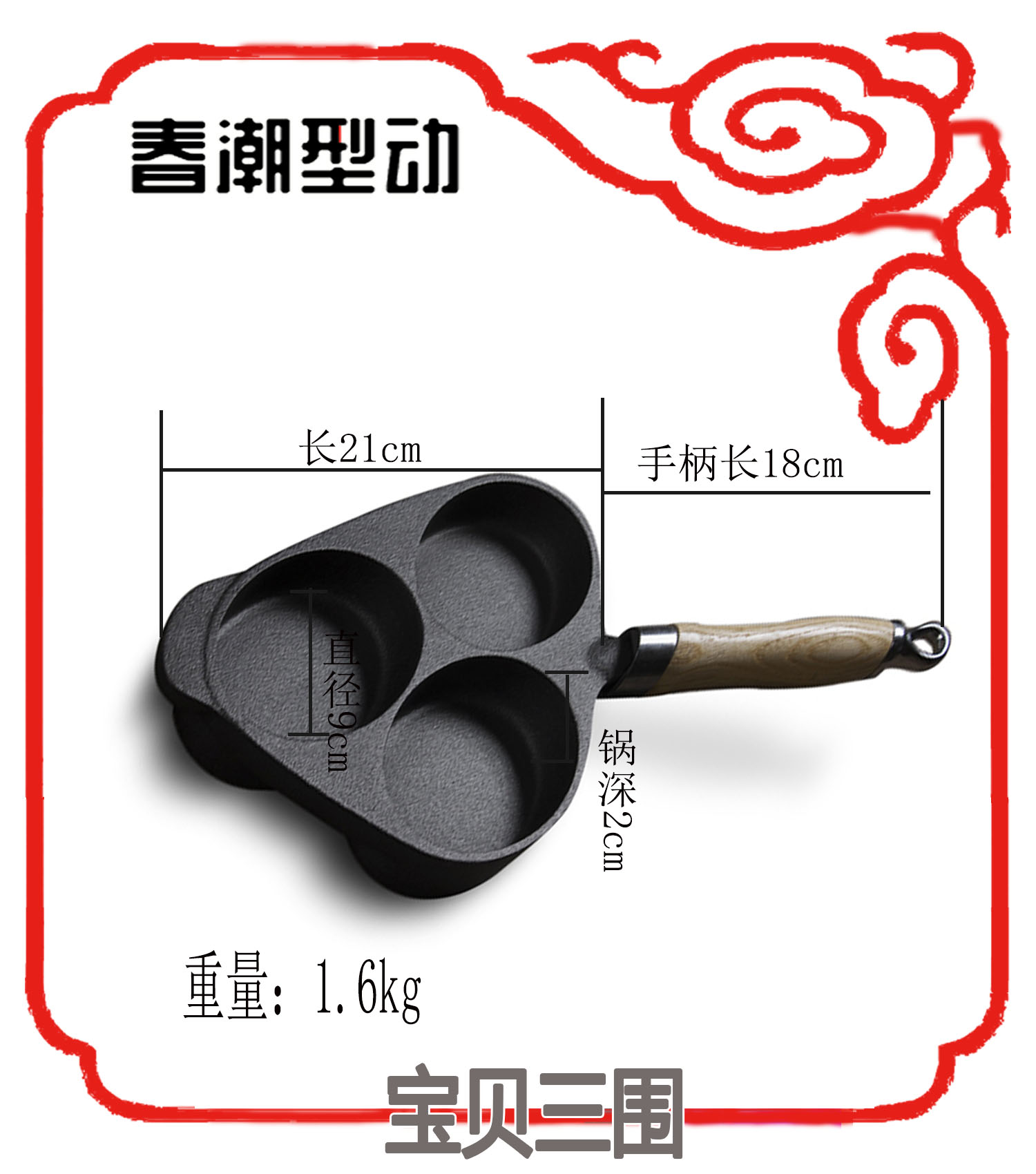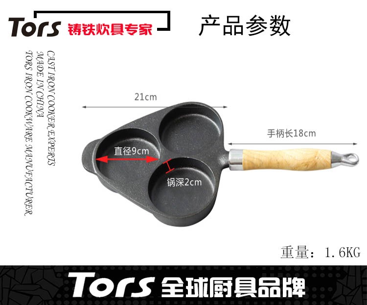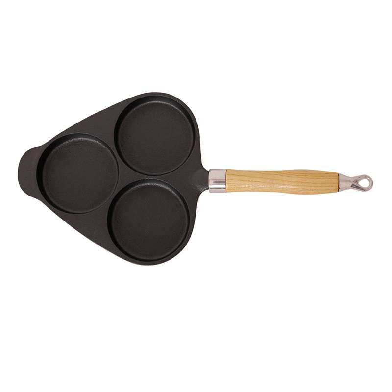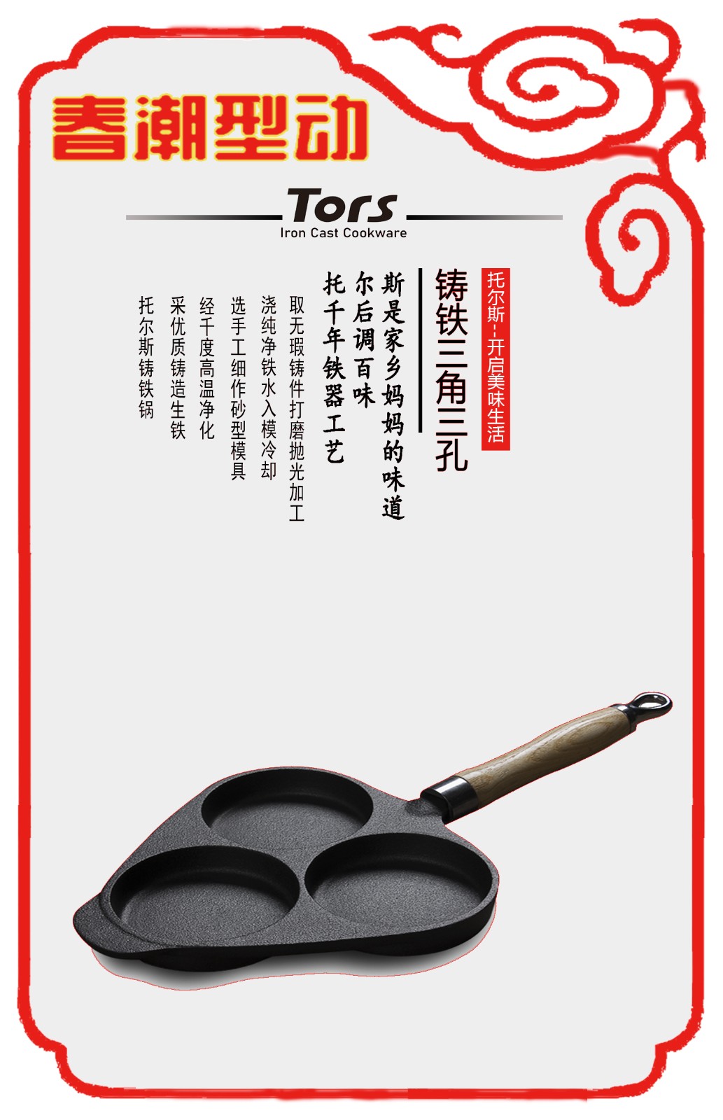 chinese Name: 木把三角三孔煎蛋锅 ITEM NO.: T-009 package size: 22*22*4cm packing: brown box weight:1.5KG